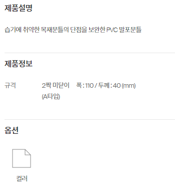 PVC 발포문틀(미닫이/연동) 중문프레임 관련링크 목록 본문 A타입(하부 오메가 호차방식)도어 하부(다대에 모헤어 부착이 가능합니다.)연동문 하부문틀 옵션(PVC발포 미닫이,연동문 모두 적용됩니다.)연동문 하부 문틀 옵션(PVC발포 3연동에만 적용됩니다.)대리석 운영컬러 이전 다음